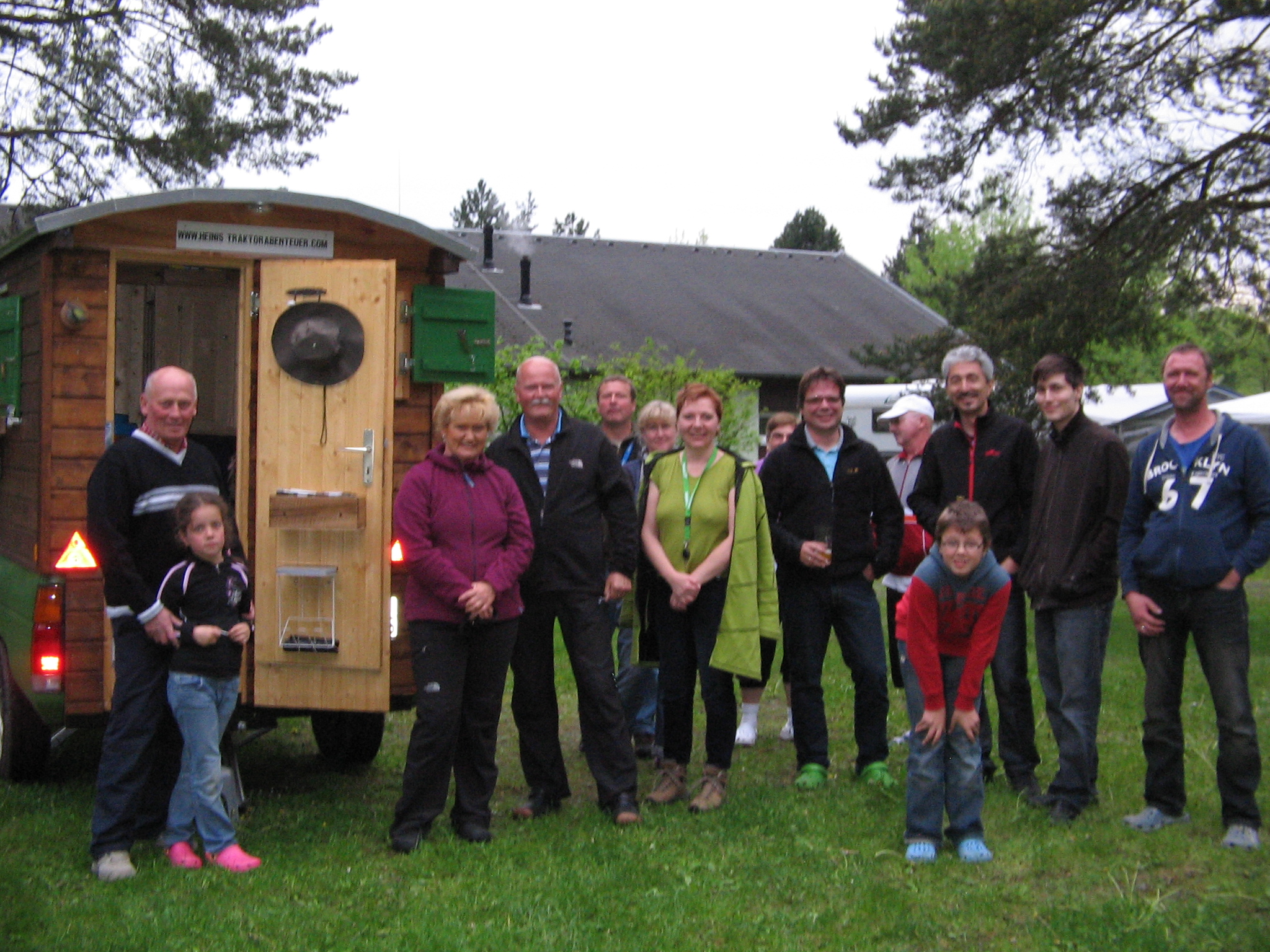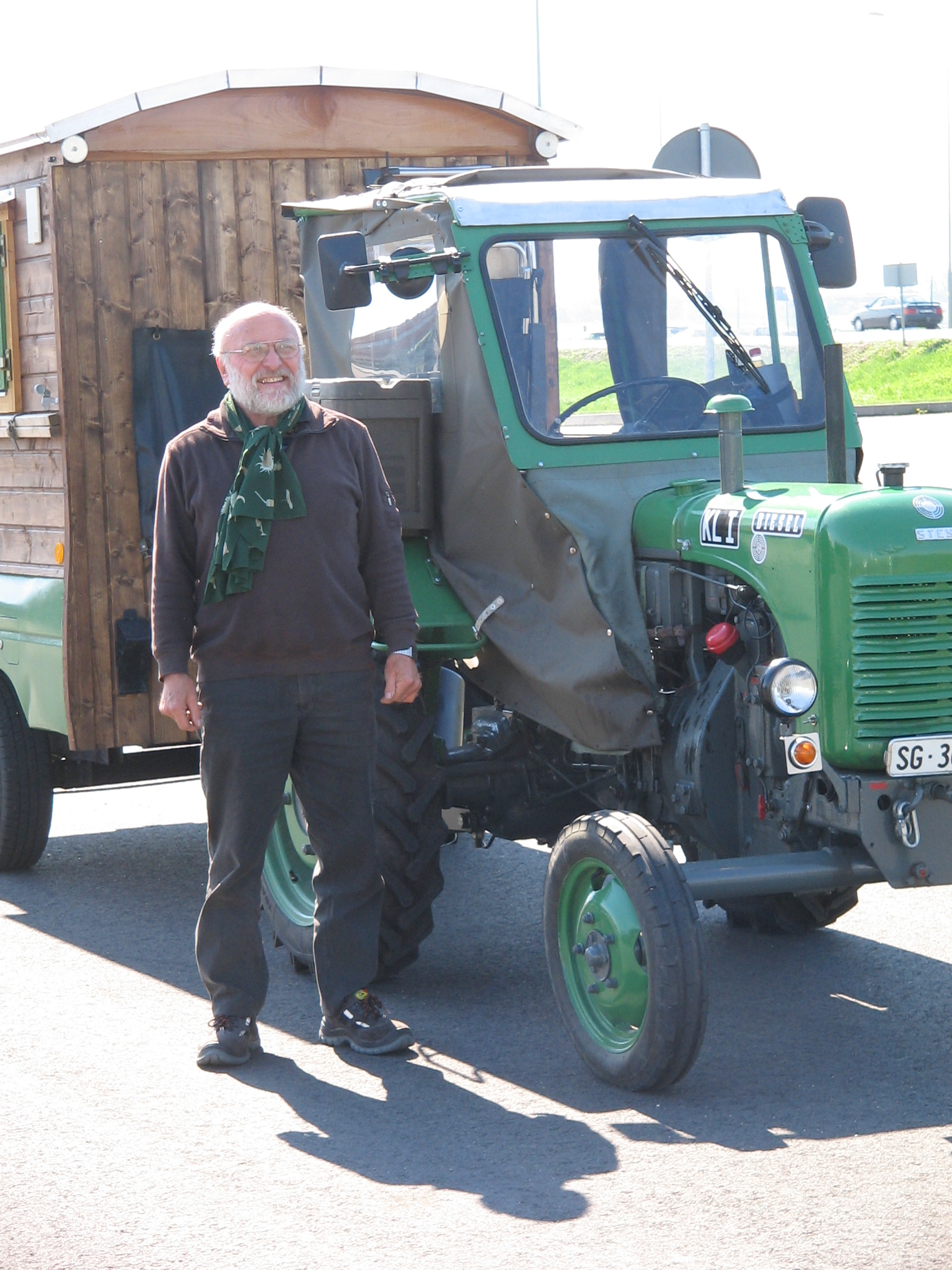 Mittwoch 8. Mai: Zum Glück fahre ich bei einer John-Deere Generalvertretung vorbei und der Geschäftsführer ist auch sofort bereit, mir die Aufhängung zu schweissen: Sogar gratis und mit den besten Wünschen. Mein Trinkgeld für die Kaffeekasse wird aber zum Glück gerne angenommen. Der 15er (mein Traktor) war übrigens zutiefst beleidigt, als er neben den grossen John Deere-Maschinen parken musste. Die Räder jener sind schliesslich höher, wie seine Gesamthöhe. Ich habe ihn natürlich sofort getröstet, sanft den Tank gestreichelt und ihm wie jeden Tag versichert, wie zufrieden ich mit ihm sei. In Windischeschenbach auf dem Campingplatz Schweinemühle mache ich Halt. Auch hier wieder nur nette Leute. Ein Bayrischer Steuerbeamter schenkt mir beim Abschied eine seltene Flasche Bier. Danke! Auf einem Parkplatz bei einem Supermarkt will ich losfahren, da kommen zwei Arbeiter vorbei. Der eine steht vor den 15er, schaut sich die Kurbel an und sagt: „Soll ich ankurbeln???“ – Gerne, sage ich, bereits mit einem Lächeln im Gesicht, weil ich weiss, was nun kommen wird. Er nimmt die Kurbel in die Hand, macht eine halbe Drehung, dann kann er nicht mehr. Er schaut mich an und sagt: „So eine Sch…..“, und zieht weiter. Ein älterer Herr kommt vorbei und sagt: „Ich kenne sie doch, sie sind in der Camper-Zeitung. Schön meine ich, ich weiss von nichts 🙂